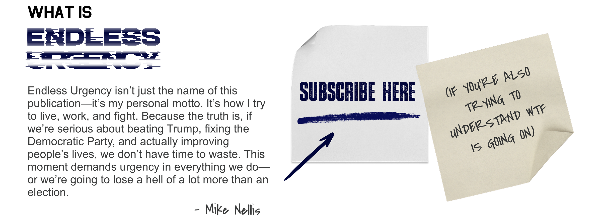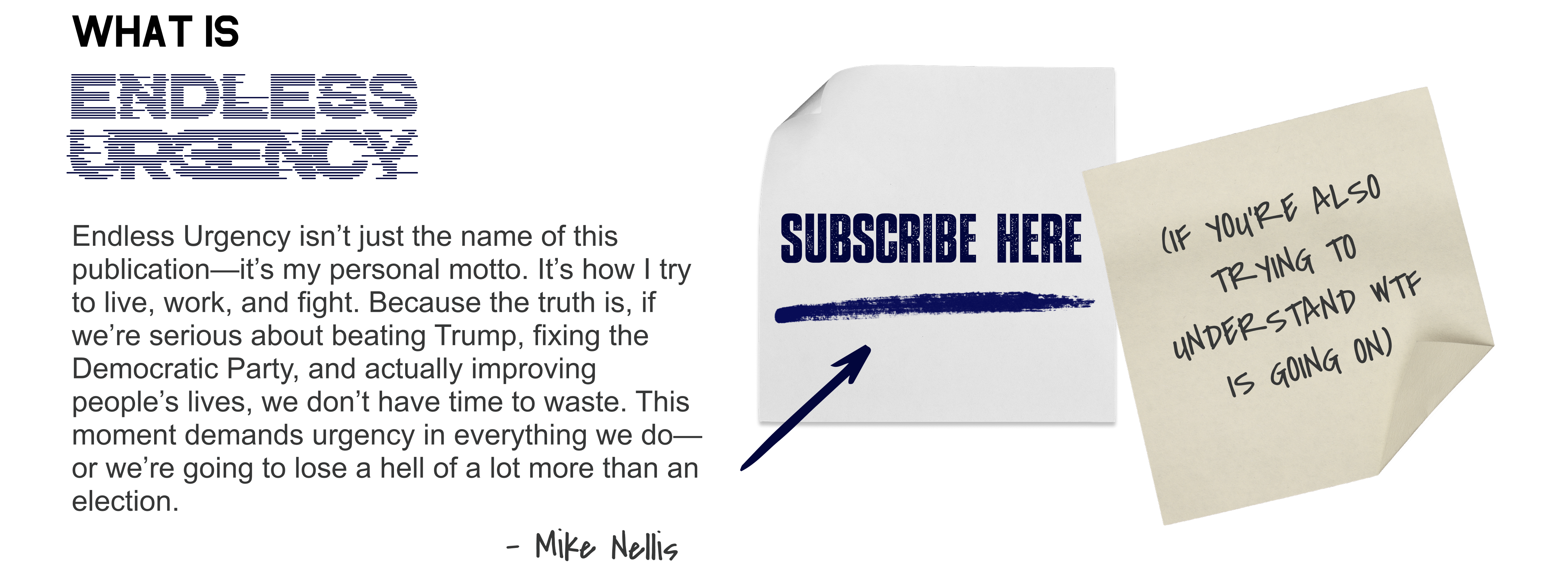 My name is Mike Nellis and I’ve spent two decades in Democratic politics—serving as a Senior Advisor to Vice President Kamala Harris for many years before she became Vice President and helping leaders like Adam Schiff, Gretchen Whitmer, Jon Tester, and Lauren Underwood win elections. I’ve raised over a billion dollars online for campaigns and causes, built one of the top social impact agencies in the country, and seen firsthand how broken—and how fixable—our government and the Democratic Party are. Endless Urgency is where I bring all of that experience together without the filters, the bullshit, or the excuses. This is about fighting harder, leading smarter, and building something that actually improves people’s lives.